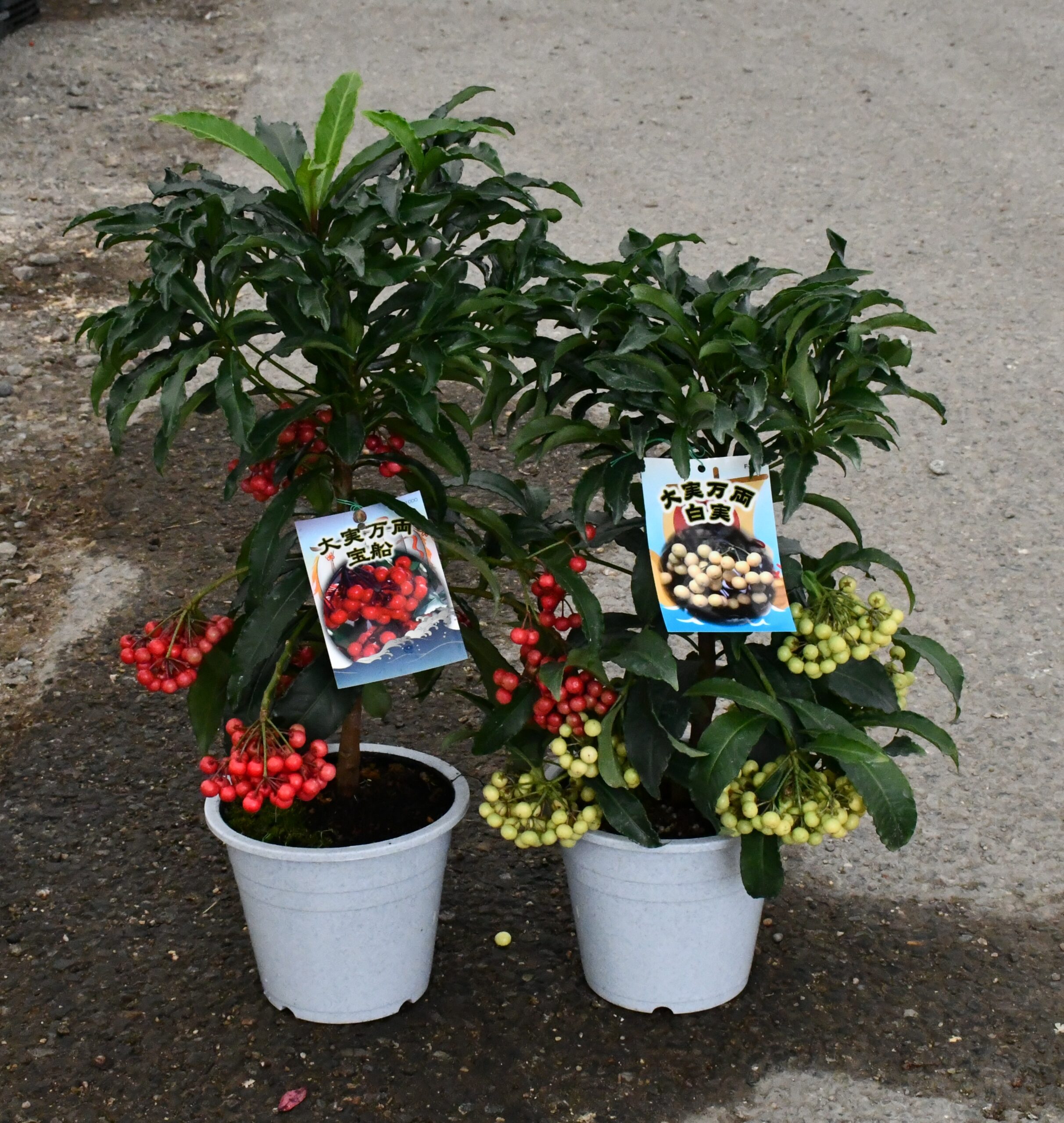 紅白で縁起が良く人気だというマンリョウの大粒品種「宝船」㊧と「白実」
